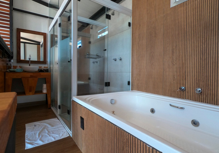 - 1 suíte com vista para o paredão, cama queen size, roupas de cama de alta qualidade, banheira de hidromassagem, secador de cabelo, amenities especiais.