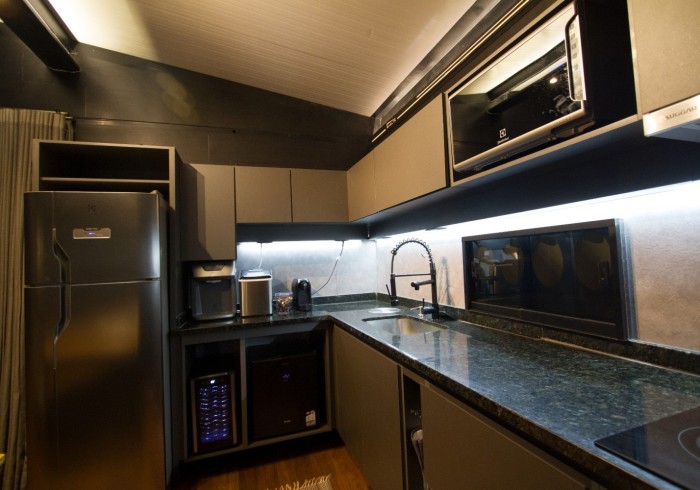 - Geladeira, Liquidificador, Água mineral, Cafeteira, Adega.